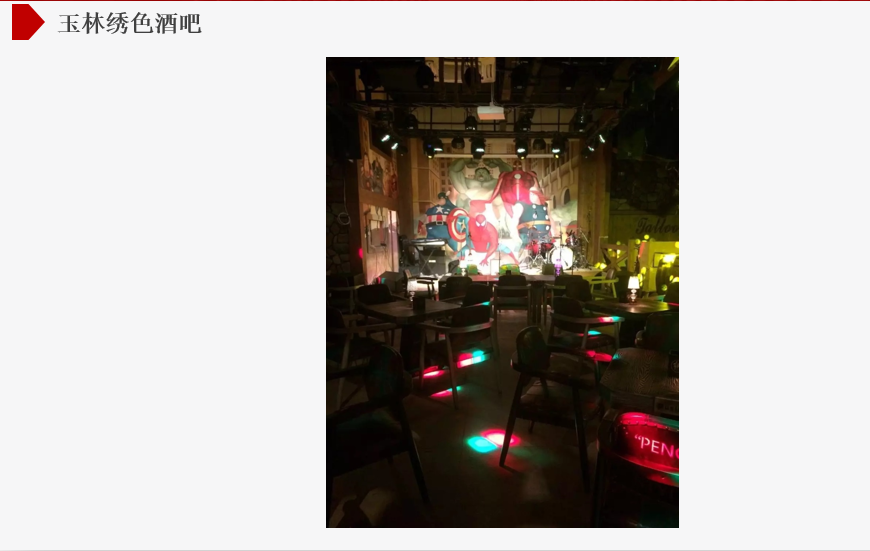 繡色酒吧是玉林市為數不多的現場樂隊類型的酒吧,開張之后,生意火爆,并經常邀請國內外的實力派歌手駐場,演奏。