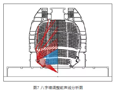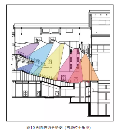 觀眾廳剖面設計取決于兩個因素。一是規范規定的每座容積,它能確定觀眾廳吊頂的大概高度;二是觀眾廳剖面聲線分析,它能確定吊頂的最終形式。結合上述兩個因素,最終確定的吊頂形式如圖9、圖10所示??梢钥闯?,經吊頂反射的聲音能覆蓋觀眾席的所有區域,其分布均勻,能達到良好的聲場效果。