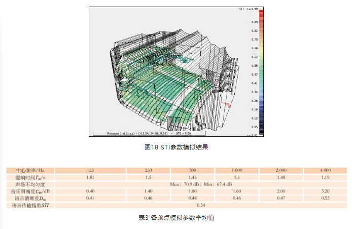 混響時間設計完成后, 采用Odeon軟件對聲場環境進行模擬,對方案起到一定的校正作用。觀眾廳各部位吸聲系數見表2,圖13為模擬軟件中三維模型圖,圖14~圖18為各參數的模擬結果,表3為各測點平均值。