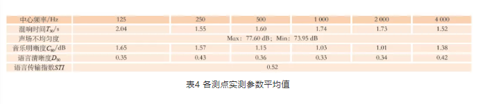 語言清晰度是評價廳堂語言聲是否清晰的參數,所有倍頻程測量結果均大于0.3,略小于要求的≥0.45,可能是由于空場環境缺少觀眾吸聲造成的。